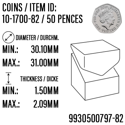 Erweiterungsaufsätze erhältlich (optional), die das Fassungsvermögen auf ca. 400 Münzen pro Aufsatz vergrößern (bei 24 mm Münzen). Maximal 2 Aufsätze bis zu 25,6 mm Hohe Auszahlgeschwindigkeit: 400 Münzen pro Minute Münzdurchmesser von 18 bis 31 mm. Dicke 1,5 bis 3,2 mm (alle Euromünzen, außer 1 Euro Cent) Schnelle Umstellung auf andere Münzgröße, durch Scheibentausch. Füllstandsmesser für Leermeldung Das Planetengetriebe bietet maximales Drehmoment bei minimalen Stromverbrauch (350 mA bis 850 mA) mit 2 Amp Spitze bei 24 VDC) CE geprüft Optischer Auslesesensor unterhalb der Plattform (Sensor kann nicht verschmutzen oder durch Licht beeinflusst werden) Auch in mit seriellen oder CC-Talk Interface lieferbar.