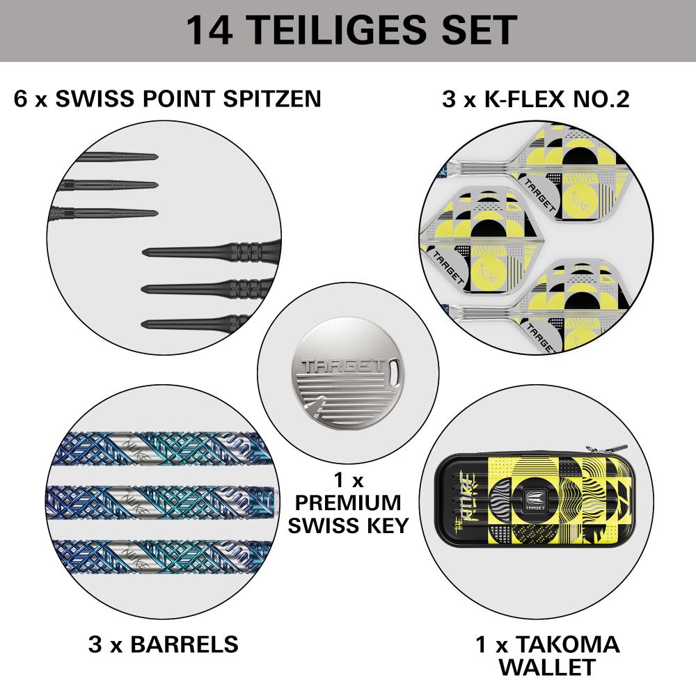 Die Darts werden vormontiert mit 30 mm schwarzen Pixel Soft Tips geliefert und enthalten zusätzlich ein Set 42 mm Conversion Points, um Spielern maximale Flexibilität beim Setup-Tuning zu geben. Spitzen und Conversion Points lassen sich mit dem beiliegenden silbernen Swiss Keyring Tool schnell und sicher wechseln – für einfache Wartung und hohe Anpassungsfähigkeit im Spiel.