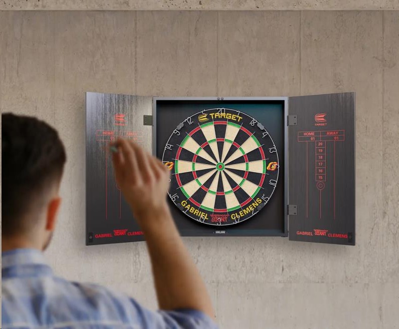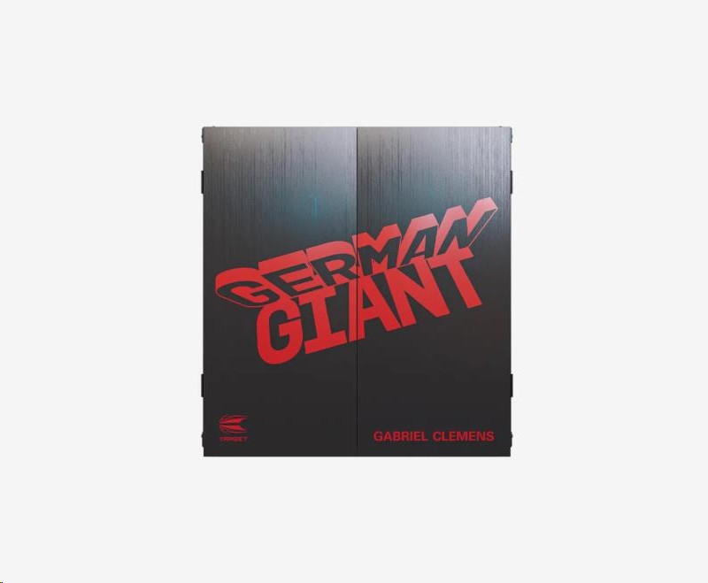 A collaboration with Gabriel Clemens, the “German Giant” dartboard cabinet set includes player-endorsed elements, with his nickname prominently displayed on the front of the cabinet doors, in a striking red paint. The dartboard features a rotational score-ring, ultra-thin wire system, and staple-free bullseye for precise and rewarding gameplay.