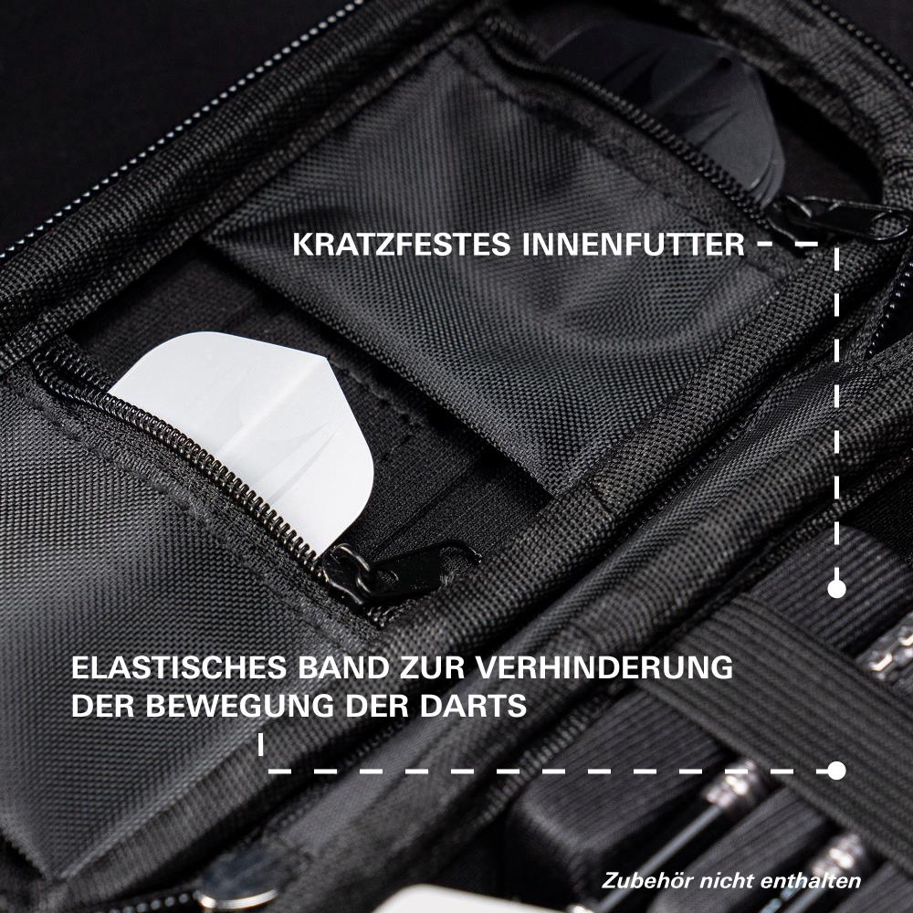 Constructed with a durable hard shell, the Takoma keeps your darts safe and protected. The scratch-resistant interior lining secures 3 fully assembled darts, while zip pockets provide space for additional accessories such as spare flights, shafts, Swiss Points, or your Swiss Point tool — combining style and practicality in one premium case.