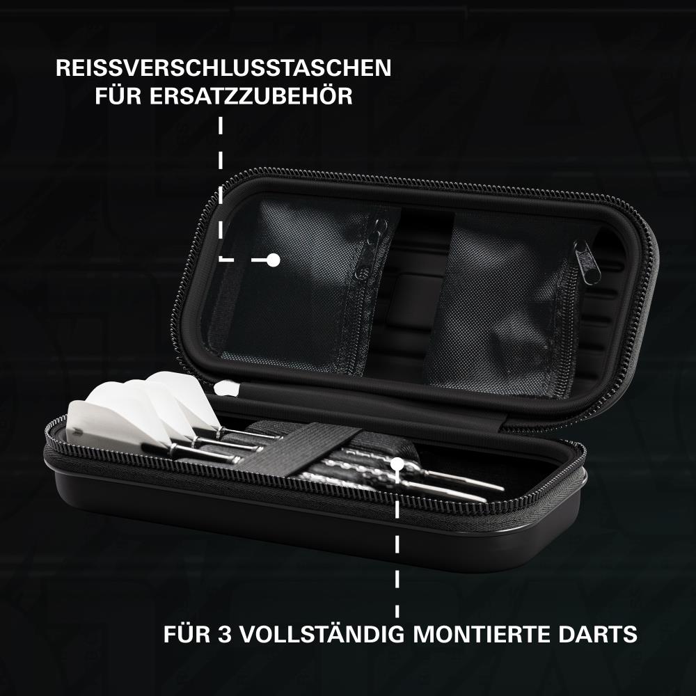 Constructed with a durable hard shell, the Takoma keeps your darts safe and protected. The scratch-resistant interior lining secures 3 fully assembled darts, while zip pockets provide space for additional accessories such as spare flights, shafts, Swiss Points, or your Swiss Point tool — combining style and practicality in one premium case.