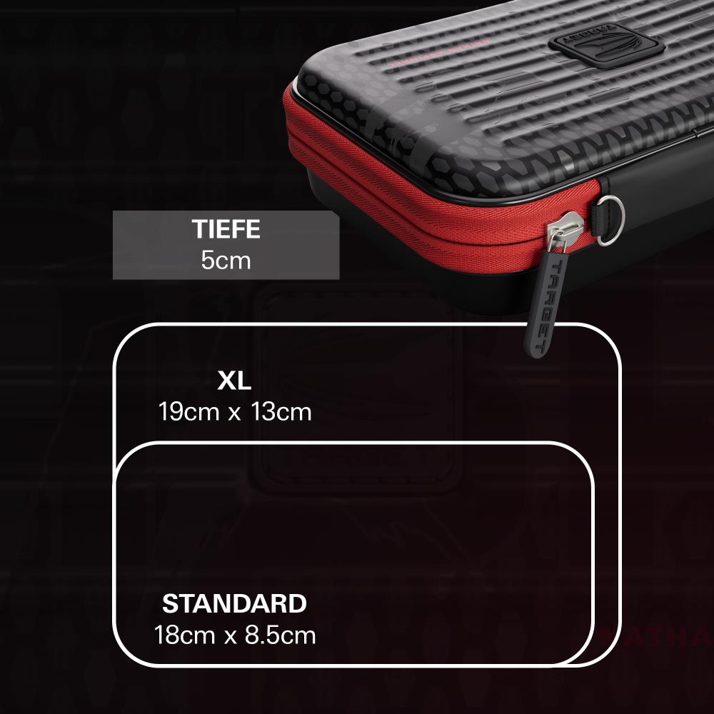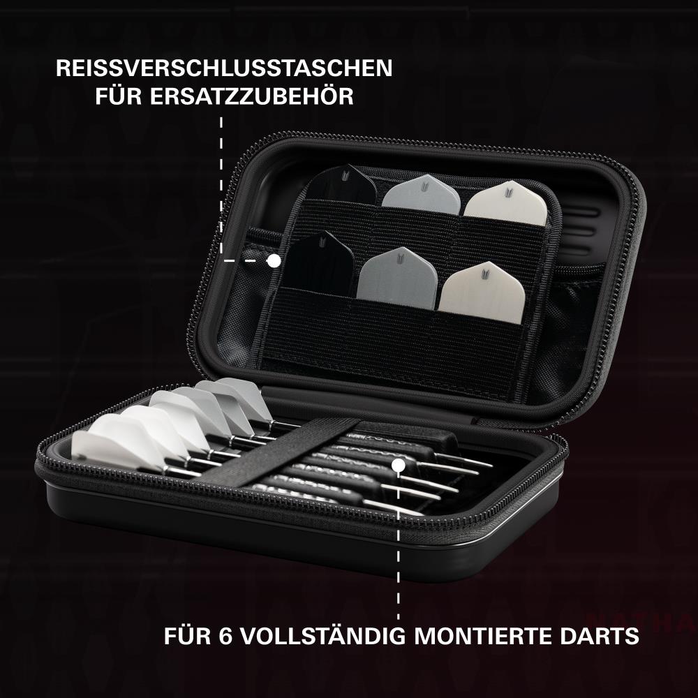 Constructed with a durable hard shell, the XL Takoma keeps your darts safe and protected. The scratch-resistant interior lining secures 6 fully assembled darts, while the larger storage space provides room for extra flights, shafts, Swiss Points, and your Swiss Point tool — combining bold design with enhanced practicality.