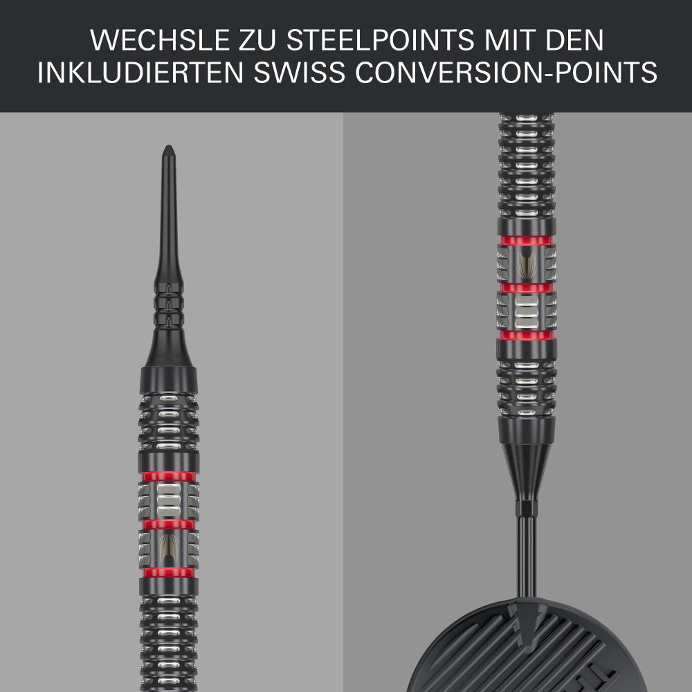 The darts are fitted with black Pixel Tips, designed with micro-grip technology for a secure hold in the board and reduced bounce-outs. Also included are 30mm black titanium conversion points, allowing for easy setup versatility between soft tip and steel tip formats. The included premium Swiss Point tool enables fast and secure point changes, maintaining top-level performance and customisation.